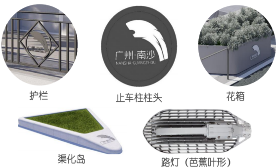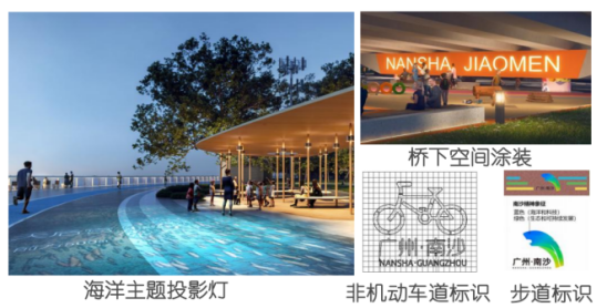 走在街头,你能看到形似芭蕉叶的路灯、融入南沙元素的花箱和止车柱柱头;桥下空间涂装成、步道标识、海洋主题投影灯也独具特色。树种选择上,区树落羽杉、区花月季等本土特色植物扮靓城市,尽显南沙魅力。